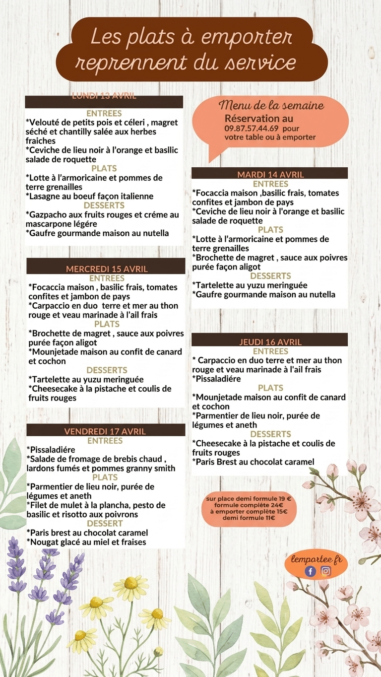 Chaque semaine nous éditons un menu sur place que nous publions sur nos réseaux sociaux et sur notre site internet. Vous pouvez ainsi plannifier vos visites au restaurant. Cette fois-ci, le menu est le même en emporté ! Facilitez vous la vie !